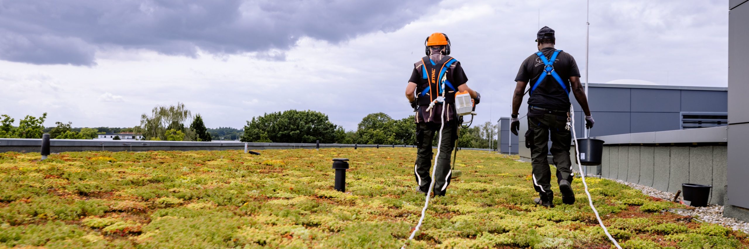 Pflegearbeiten auf Dächern erfordern Fachwissen und die richtige Ausrüstung. Unser Team ist für Arbeiten in der Höhe geschult und kennt die technischen Anforderungen unterschiedlicher Dachbegrünungen.